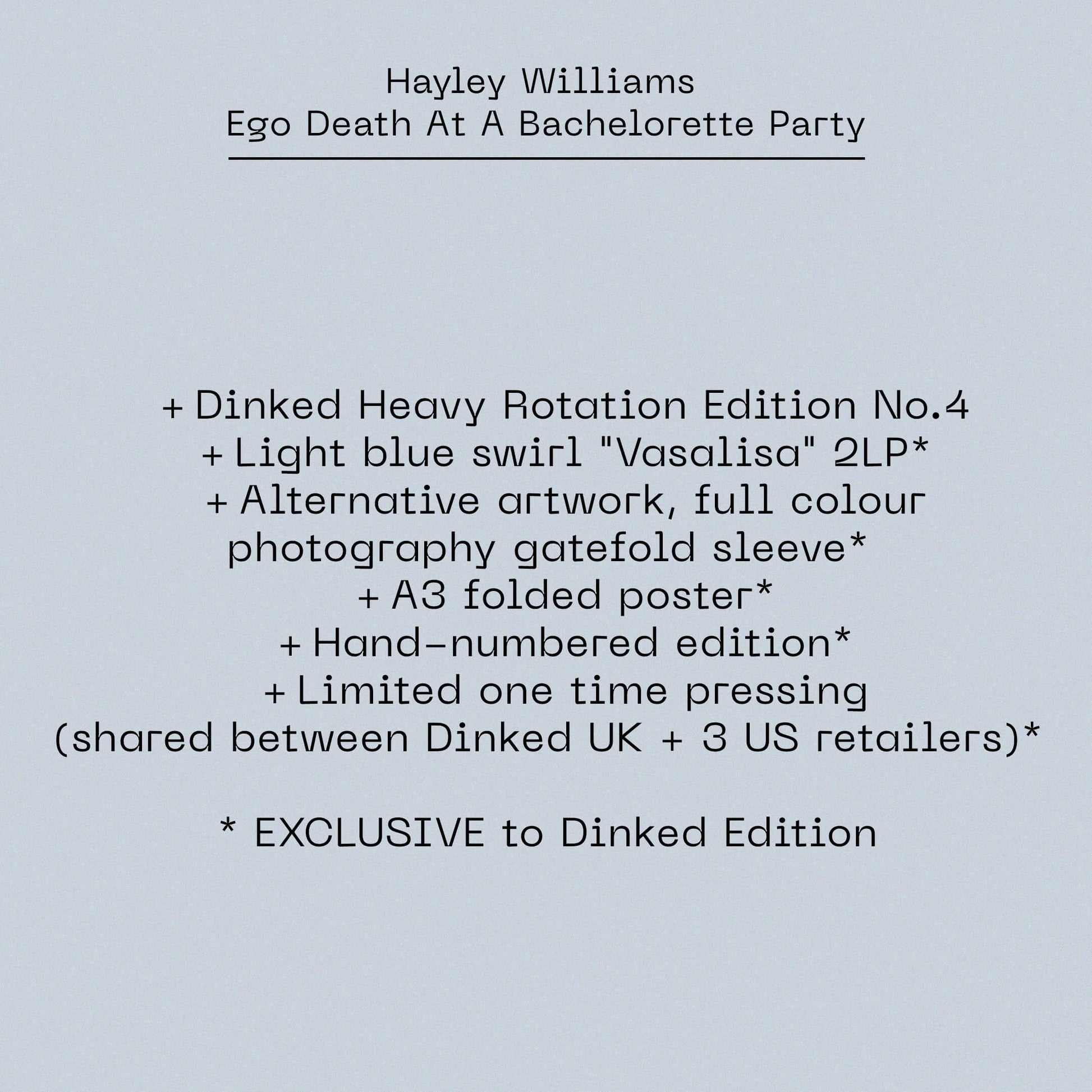 The package includes exclusive alternative full colour artwork across a hand-numbered gatefold sleeve, a brand new poster and an all new light blue swirl double vinyl colourway that Hayley has personally selected and named for us: "Vasalisa" - a reference to a lyric from album track ’Negative Self Talk’.